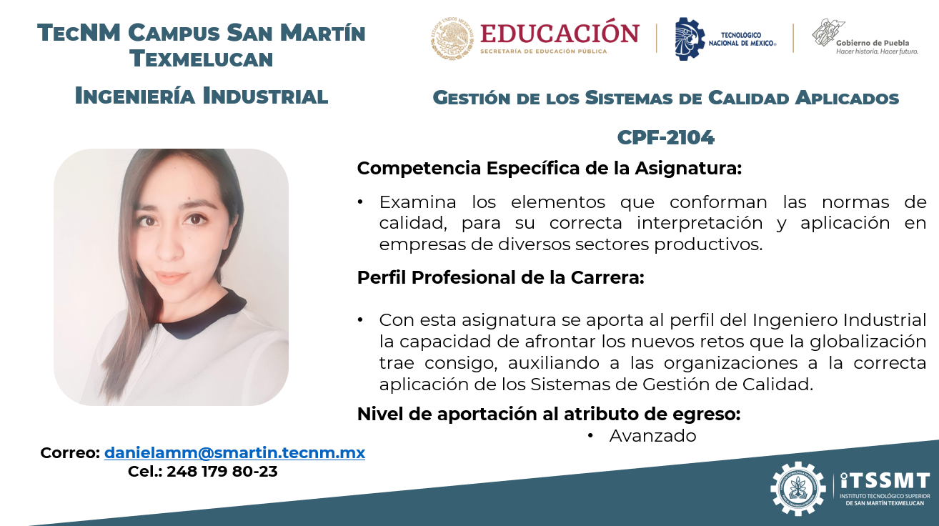 Esta asignatura aporta al perfil del Ingeniero Industrial los medios para diseñar, implantar y mejorar métodos de trabajo y sistemas de calidad, de igual forma deberá ser capaz de diseñar y mejorar los productos y el servicio al cliente, esto apoyado de una adecuada utilización del diseño de experimentos para el análisis y mejoramiento de los puntos críticos en la calidad de productos y servicios.